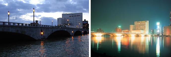 たそがれの万代橋とライトアップされた万代橋。