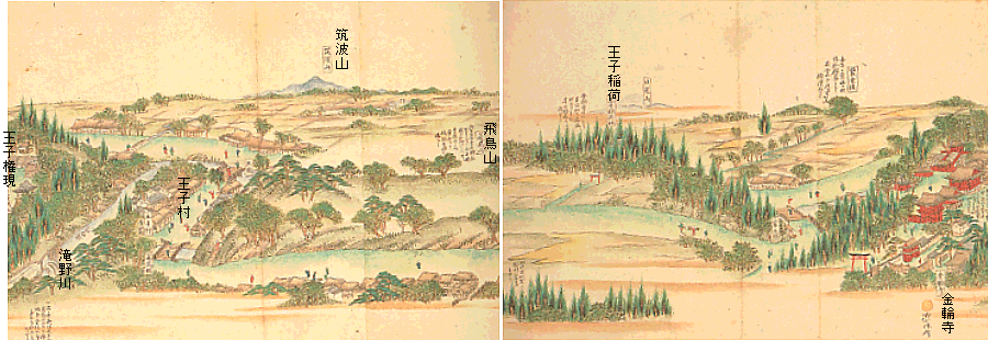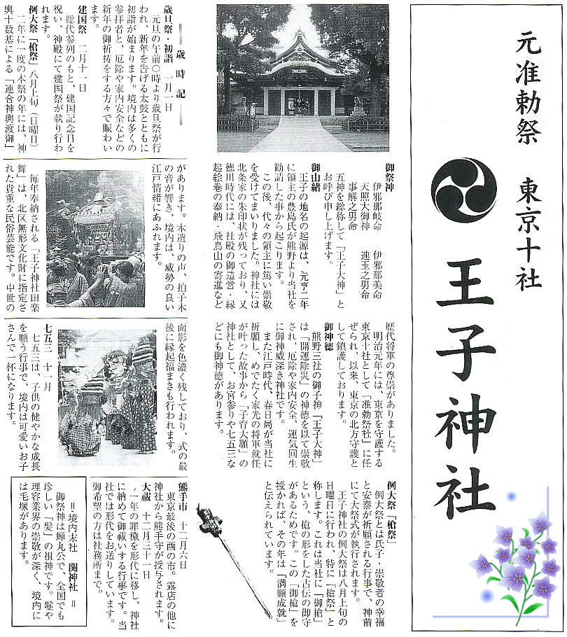 <王子神社> 王子神社は、元亨2年(1322)この地の領主であった豊島氏が、紀州熊野三社より勧請したことにはじまり、王子権現 として親しまれてきた。王子の地名はここに由来するといわれている。ここの大イチョウは、都の天然記念物に指定さ れている。この王子神社には「関神社」があり、百人一首で有名な蝉丸法師を祭っている。又この神社は「髪の祖神」 として知られ、全国のかつらやさんや理容業界の神とされている。 本殿は徳川幕府により、江戸城天守閣を建てた木原杢之丞らを棟梁として、寛永11年(1634)に建てられた。しかし、 太平洋戦争の空襲で焼失し、現在の権現造りの社殿は昭和38年の再建である。