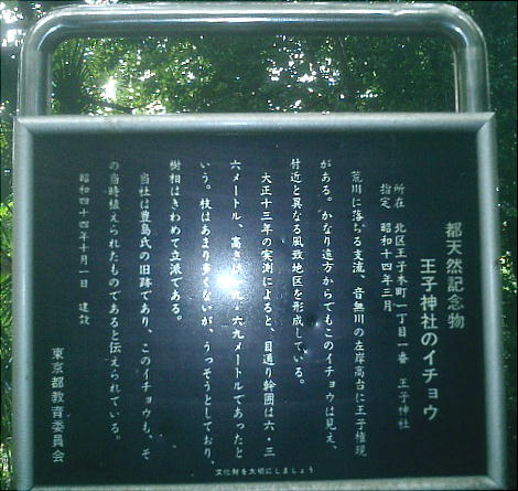 荒川に落ちる支流、音無川の左岸高台に王子権現(王子神社)がある。かなり遠方からでもこのイチョウは見え、付近と 異なる風致地区を形成している。大正13年の実測によると、目通り幹囲は6.36m、高さは19.69mであったと いう。枝はあまり多くないが、うっそうとしており、樹相はきわめて立派である。当社は豊島氏の旧跡であり、このイ チョウも、その当時植えられたものであると伝えられている。 (東京都教育委員会)