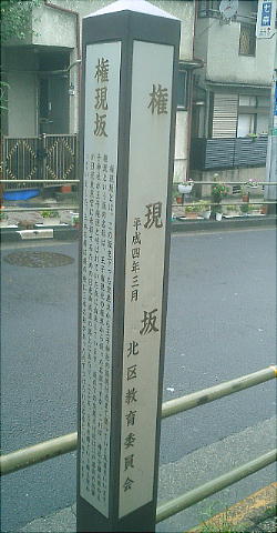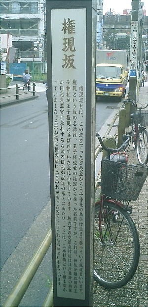 権現坂(ごんげんざか)とは、この坂を下った交差点から王子神社の鳥居付近まで登っていく坂道をいう。権現という 坂の名称は、王子権現社の権現から採った名前だが、これは、神仏分離以前の王子神社が王子権現と呼ばれていた点に 由来している。坂の下の交差点付近は江戸幕府の将軍が日光東照宮に参拝するための日光御成道の路上にあたり、ここ は、三本杉橋という橋も架かっていた。三本杉橋は橋の袂(たもと)に三本の杉があったのでつけられた名称といわれ ている。 (北区教育委員会)