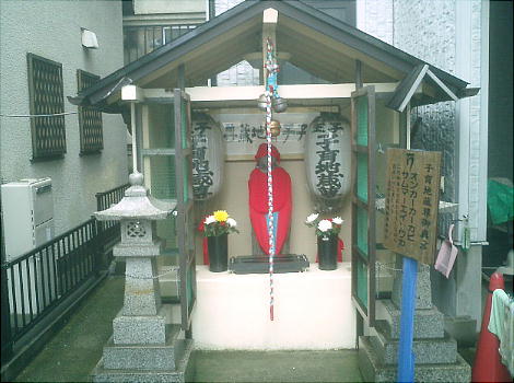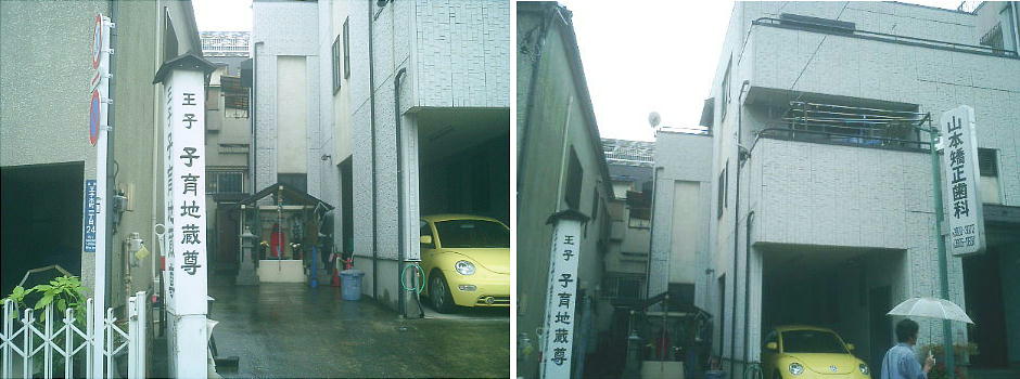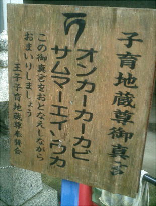 王子神社から、JR王子駅の方へ権現坂を下りてきたところに、小さな「子育て地蔵」という祠があった。説明板には 「山本家」の祖先が祀ったという記事もあるが、どうやらその子孫は健在で、今もこの地蔵様をあがめているようであ る。しかし説明板の字はなんとかならんかね。