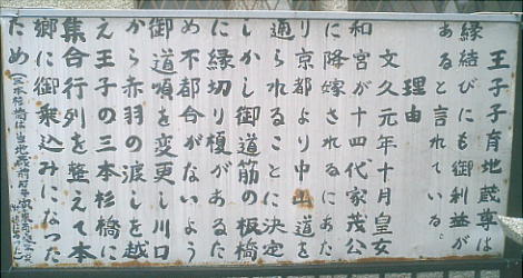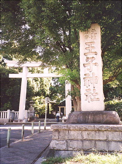 岸村に「御子神若一王子社(みこがみわかいちおうじしゃ)」が勧請されてから王子村と改めた。王子とは熊野権現の 遥拝所のことで、今も和歌山県には多くの王子がある。単なる遙拝所ではなく、休憩所、簡易宿泊所のような機能を持 っていたようだ。かっては、大阪の天満橋から熊野へ詣でる間に九十九の王子があったというが定かではない。平安朝 に最盛期を迎えていた熊野詣でも、鎌倉・戦国時代には廃れ、そのうち王子の場所もわからなくなった。江戸時代の紀 州藩が、荒れていた王子を相当整備し有る程度復活したようである。