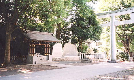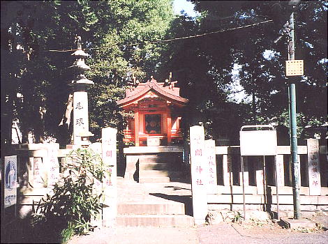 <関神社> 祭神に蝉丸・逆髪姫・古谷美女。戦災で焼け、昭和34年社殿再建、同36年毛塚造立。同45年社殿新築。平成10 年「毛塚」も建て替えられた。病で髪が抜けた蝉丸が古谷美女に命じて、姉の髪で鬘を作って貰い隠したという伝説に 基づいて祭神としたもので、氏子は映画六社、かつら組合、人毛組合、床山組合、美容組合などである。