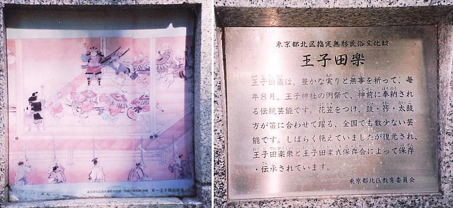 田楽は、広い意味では五穀豊穣を祈って催される中世芸能と言われる。しかし日本各地に今も残る田楽をみると、必ず しも稲作に関係したものばかりとは言えない。寺社の中で行われる田楽は、田遊びや田植え踊りの要素よりも、大陸起 源の色濃い曲芸的な品玉・跳躍などの動作に代表される田楽踊りの系統を引くものが多くみられる。王子田楽は田楽踊 りの系統に属するもので、中世に伝来した。以来、王子権現社(現在の王子神社)に伝承された民俗芸能である。 江戸時代には、金輪寺十二坊から田楽法師を出し、旧暦の7月13日に境内の舞台(現在は滅失)で花笠を被り、衣装 を着けた躍り手が十二番の演目を奉納したことが、当時の地誌など多くの見聞記録に記されている。華やかな衣装と雅 やかな踊りは、江戸の人々を大いに楽しませたことだろう。 戦争で長らく中断していた王子田楽だったが、地域の人々の努力により昭和58年に復興を果たした。現在は毎年8月、 王子神社の例大祭最終日の午後、境内の仮設舞台で、地域の子供たちが躍り手となって王子田楽が執り行われている。