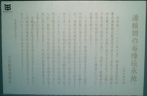 北区教育委員会の、源頼朝の布陣伝承地の立看板。