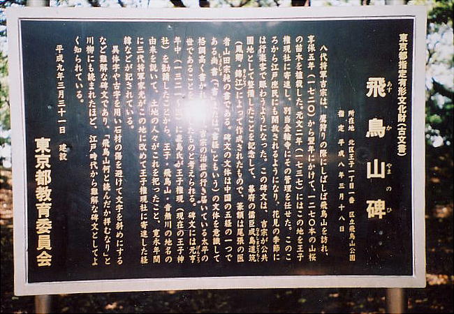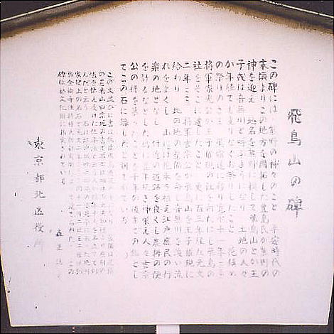 地名が飛鳥山の起きたという。飛鳥明神は、寛永の頃王子権現に合祀されたので現存しない。この碑は元文ニ年