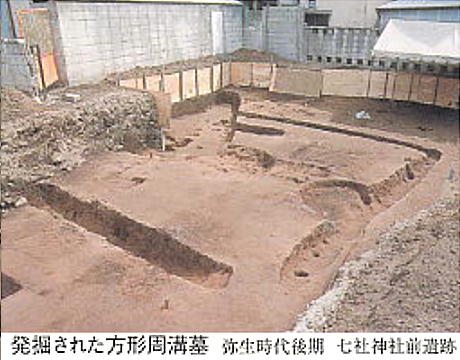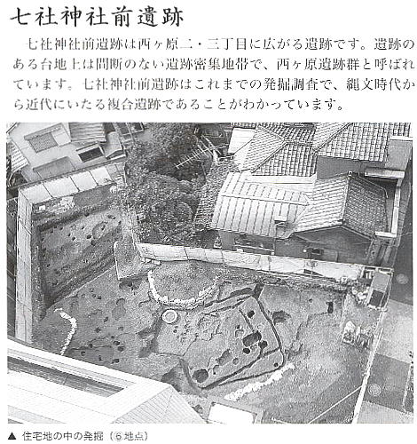 この境内から隣地にかけての一郭は、七社神社裏貝塚・七社遺跡として知られ、縄文式土器・弥生式土器・土師