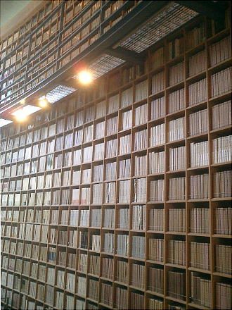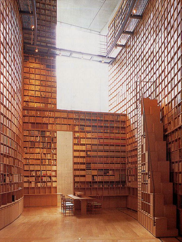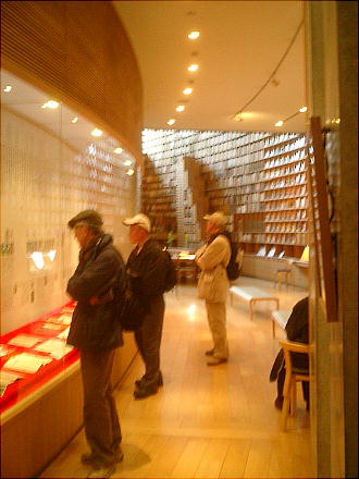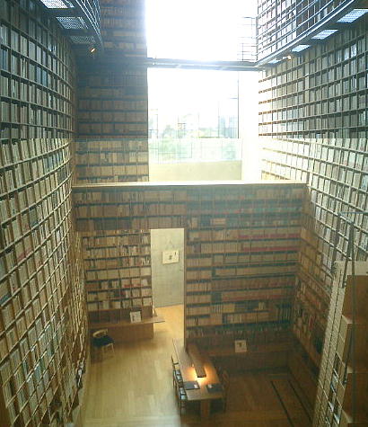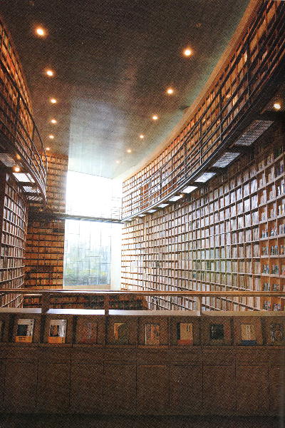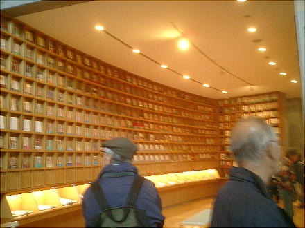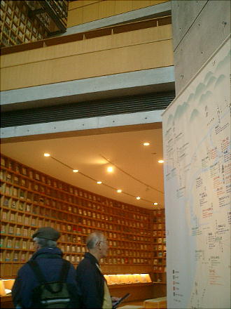 品々も展示してはあるのだが、圧倒されるのが高さ11mの大書架である。2万余冊の蔵書を使って床から天井まで
