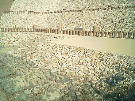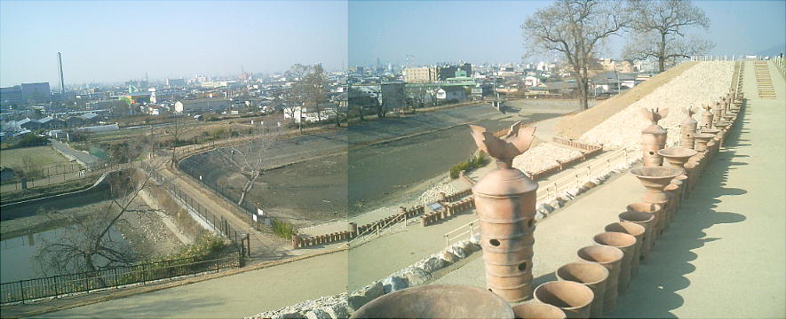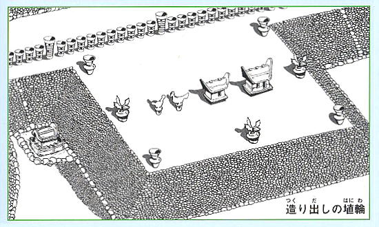 平坦部には円筒埴輪と呼ばれる、筒型の埴輪が立てられ、盛った土の斜めの所には、葺石が施されていた。また、