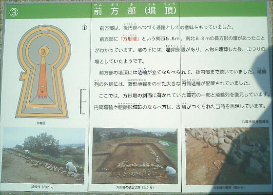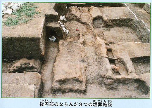 北側の後円部には、3つの埋葬施設があり、南側の前方部の四角い丘には、方形壇(ほうけいだん)と呼ばれる