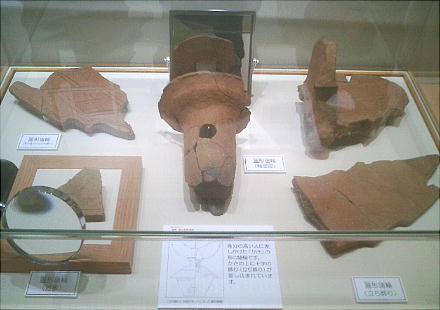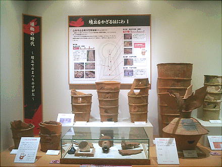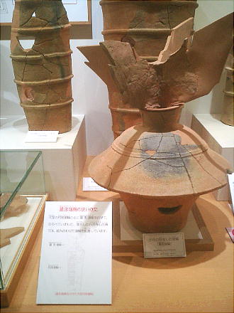 上右は蓋形埴輪(きぬがたはにわ)。蓋は衣笠とも書き、身分の高い貴人の上にかざした、長い柄のついた傘の