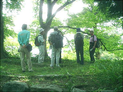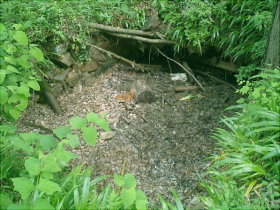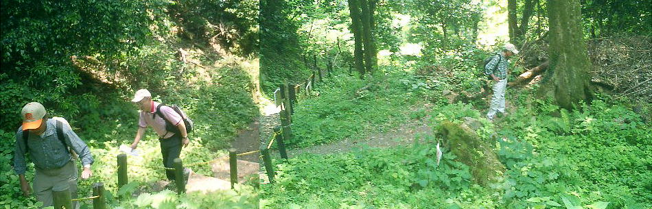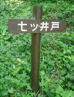 河内さんが「七つ井戸」の一つを覗き込んでいる。この辺りに七つあった事からこの名があるが、草に隠れてたら危ないな。