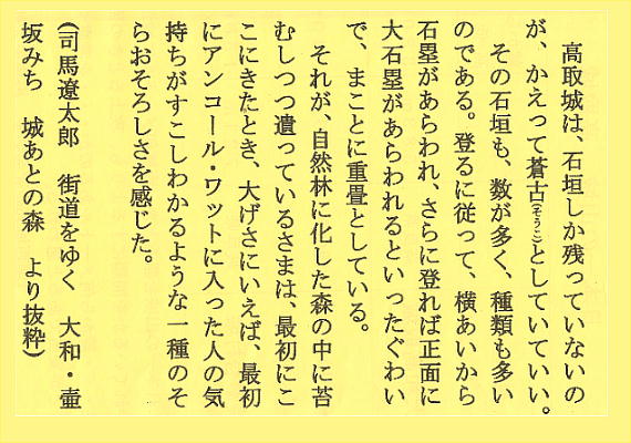 ため現在は石垣しか残っておりませんが、それが古代へのロマンをかきたてます。司馬遼太郎「街道を行く」でも、次の