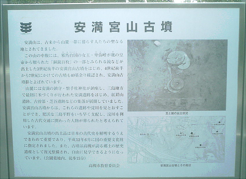 次にこの三島地区おいては邪馬台国時代に続く古墳時代の到来の兆しを表す遺蹟も多い。安満宮山の豪族の後裔の痕跡