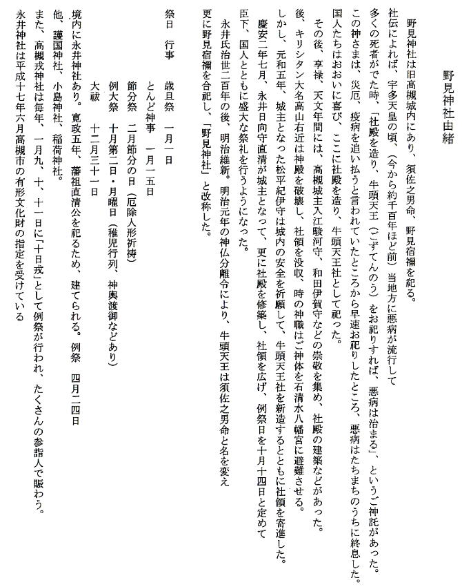 野見神社で行われる祭りには、その子孫も参加するそうである。この神社はもと高槻城内にあり、高山右近を除いて