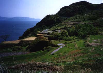 新井崎神社へ降りていく道に「新井の千枚田」と呼ばれる棚田がある。日本海を望む、美しい海岸線を見下ろす急斜面に連