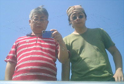 上左のアルミ板に写った姿を写す。私とセガレ(上右)。