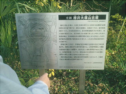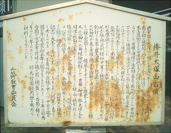 山背古道にある椿井大塚古墳の説明板。ここから右へ折れて20mばかり行くとJRの線路に出会う。