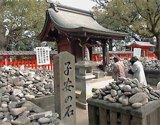 安産の神「湯方社」の周りには丸い石が山積になっている。神功皇后が応神天皇を産んだ時、産湯をつかわせた官女を