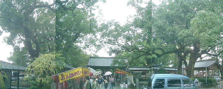 者が絶えない境内には、国の天然記念物に指定されている大樟(湯蓋の森、衣掛の森)や、県の天然記念物の「蚊田の森」