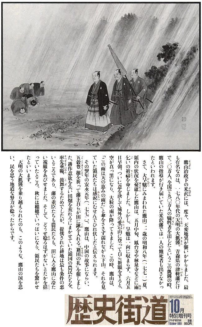 10才で宮崎県高鍋藩から上杉へ養子に来て、17才で藩主となり、この厳しい藩の財政を立て直した。人々が豊かになるた