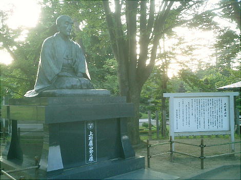 上杉神社に立つ銅像、上杉鷹山。宝暦元年7月20日(1751年9月9日) - 文政5年3月11日(1822年4月2日)