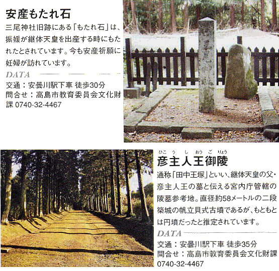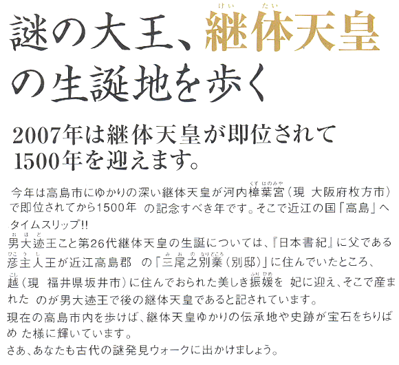 第122回例会 「近江説による」継体天皇の生まれ故郷を訪ねる 例会案内 <日時>: 2007年5月27日(日曜日) <集合>: JR大阪駅 中央改札前 AM9:00集合 <交通>: 適時、定刻までに「大阪駅」へおいでください。 <持参するもの>: 弁当、水筒・雨具・カメラ・その他 <行程>: @JR大阪駅(9:15発)−(JR新快速湖西レジャー号・敦賀行き) −JR安曇川駅(10:27着) <距離93.3km 11駅 1時間12分 片道1,620円>![]()