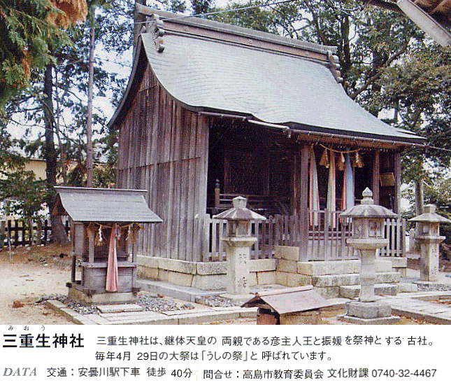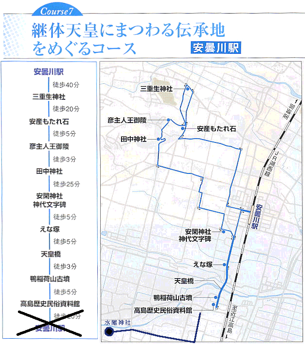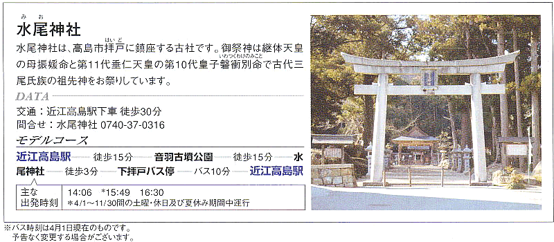 歴史民俗資料館から15分ほどで、以下の水尾神社へ行けます。ここからは30分ほどで「近江 高島駅」です。「安曇川駅」へただ引き返すのもあまり能がありませんから、是非頑張って「水 尾神社」まで行きましょう。 歴史民俗資料館 −15分− 水尾神社 − 30分/バス10分 − 近江高島駅