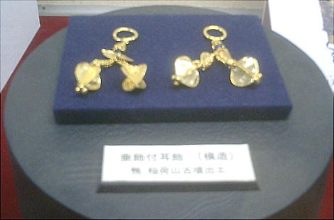 上左が、鴨稲荷山古墳出土の垂飾付耳飾(レプリカ)である。これは、中間飾にガラス玉を使っているあたりが特徴的で、韓国の