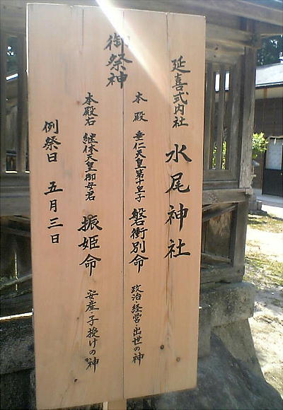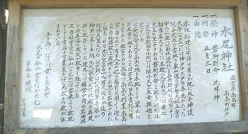 る。近江高島駅の北西3Kmほどの拝戸に鎮座する。水尾神社は延喜式に名神、大社に列する古社で、古代この地方に栄えた三尾