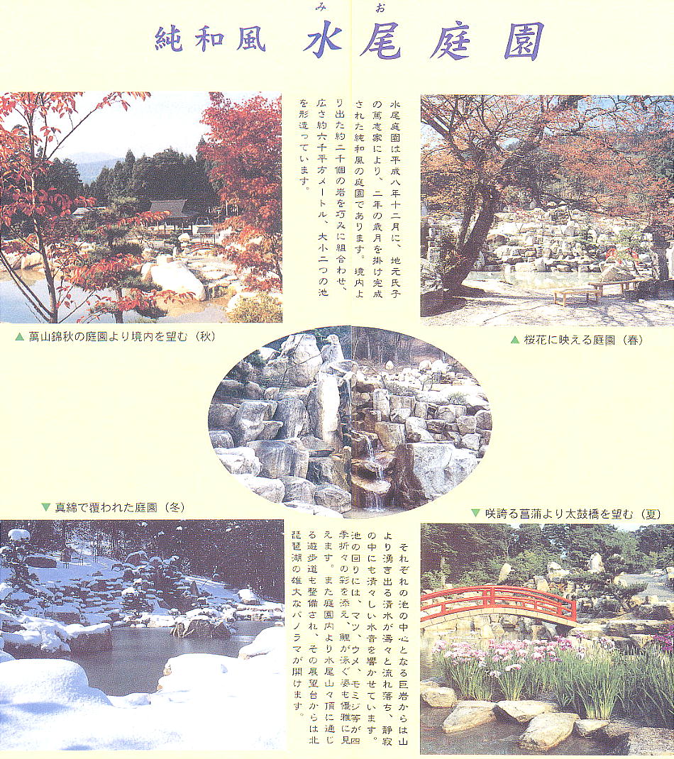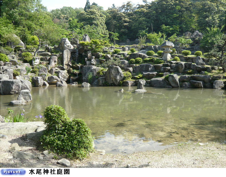 面には水尾庭園があり、岳山の大小の岩を配し、豊かな山水が流れ落ちる。かつては広大な神域であったようで、音羽の大炊神社