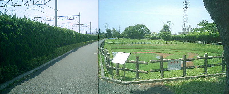 資料館わきから鉄道引込線の踏切をわたると、古墳時代の住居、弥生時代の環濠、葦原、奈良平安時代の建物跡が並んでいる。