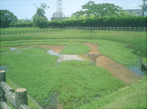 弥生時代の環濠の一部(北端)がそのまま保存されているかつての伊場ムラ周辺。湿地がひろがっていたと思われる。ここでは三
