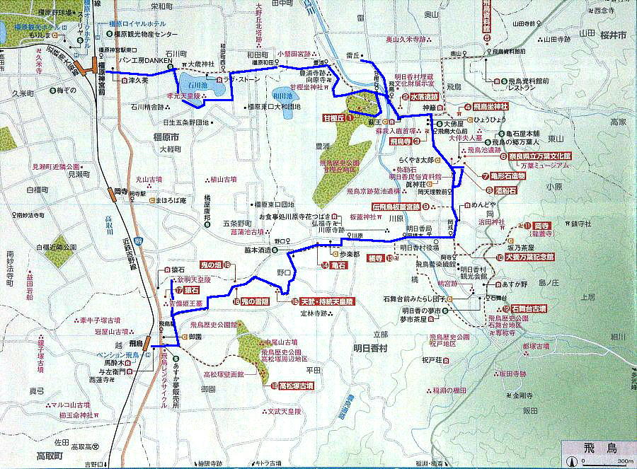 上記青い線が本日のコース。今回は明日香村観光協会発行の「飛鳥パスポート」を活用した。100円でなかなかの優れもの。