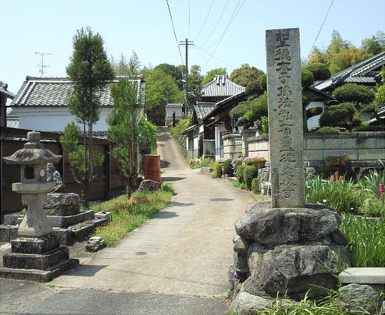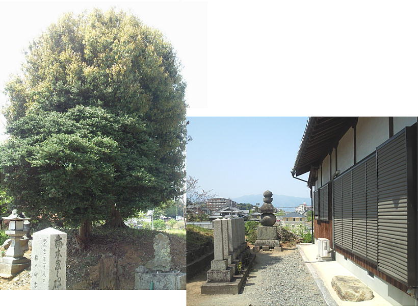 石川精舎跡とされる本明寺。奧に見えるのが「五輪塔」。畝傍東小学校前の畑の中、橿原市街を見下ろす小高い
