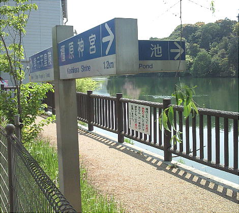 「剣池」から畝傍東小学校の側を通って南へ向い、橿原市五条野町へ入って右へ折れ、西へ向かって近鉄吉野線「岡寺駅」の方へ