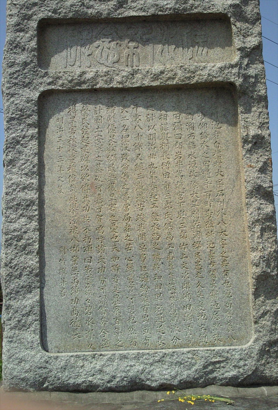 池の畔に立っている「石川池顕彰碑」。漢字はキレイに読めるが、悲しいかな意味が良くわからん。明治33年に堤防を整備した