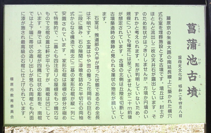 日香村屋内ゲートボール場の手前に、「菖蒲池古墳」がある。藤原京朱雀大路の南延長線上に築かれた古墳で、墳丘は封土がほと