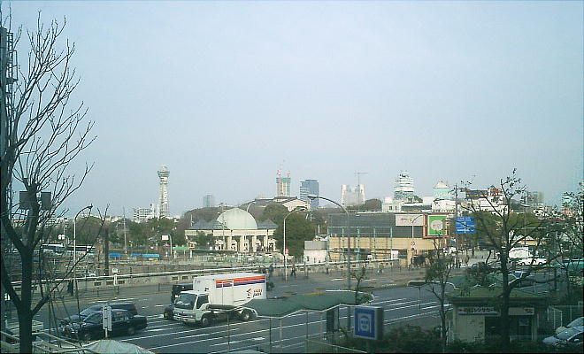 JR天王寺駅から近鉄阿部野橋駅(下左)へ向かう歩道橋からみた天王寺公園方面(上)。通天閣が見えている。