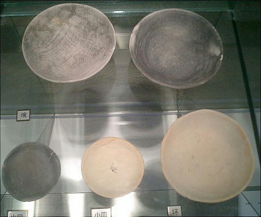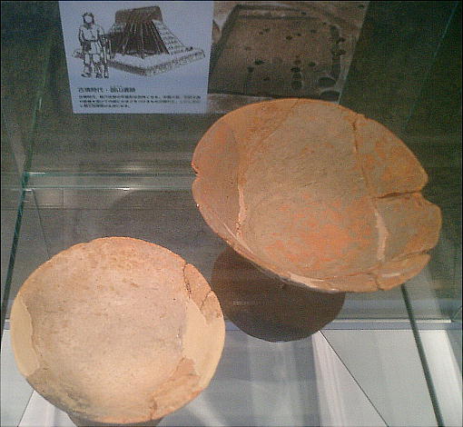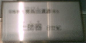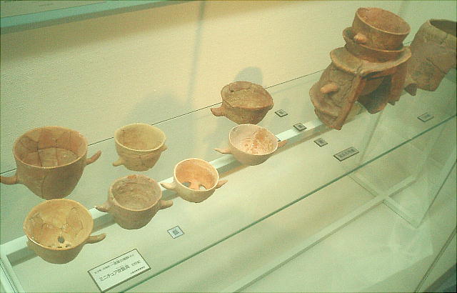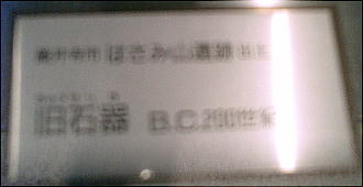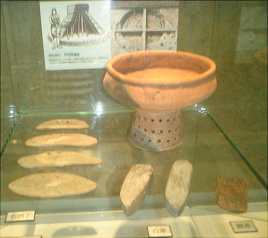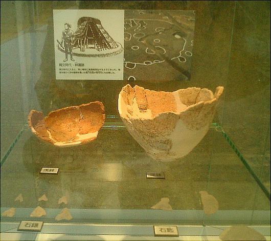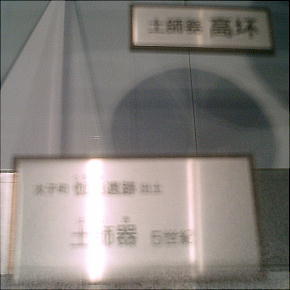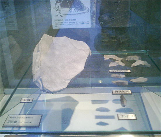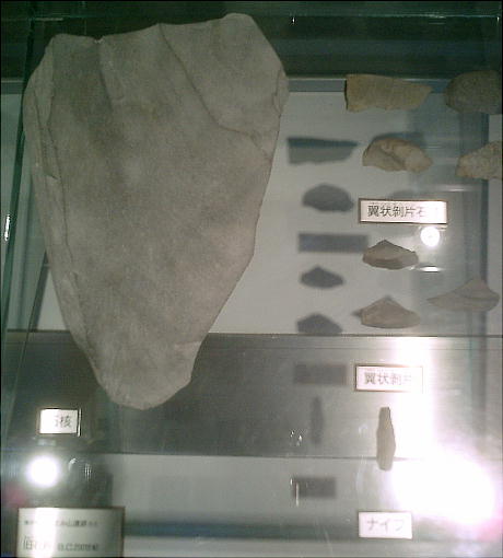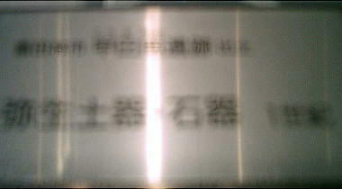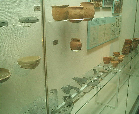 展示場入り口に、周辺から出た石器・土器が並べてあった。接写が弱いデジカメのせいでどこの遺跡かがよくわからない。