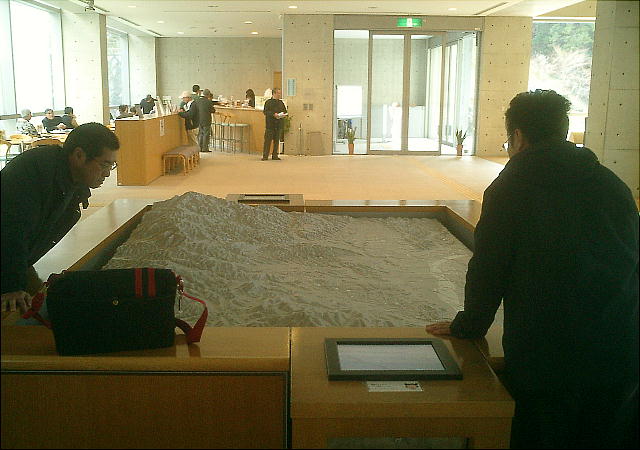 博物館周辺、一須賀古墳群の模型を見る渡邊さん、井上さん。小学校の夏休みにこういう模型造ったなぁ。
