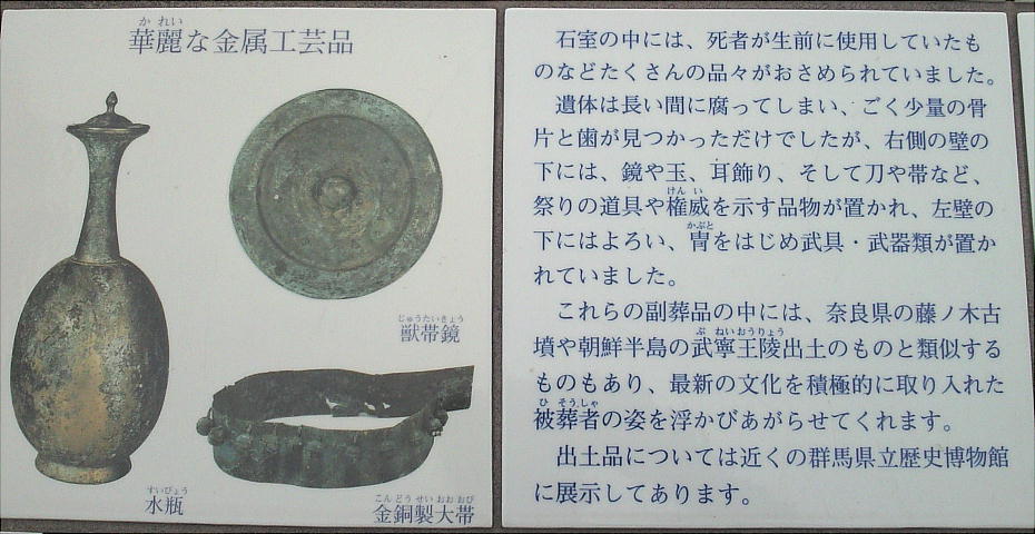 綺麗に整備された古墳で、上毛野最後の前方後円墳と言われ、6世紀末の築造である。昭和42年からの発掘調査で、石室内から