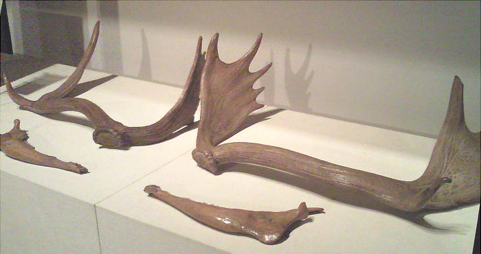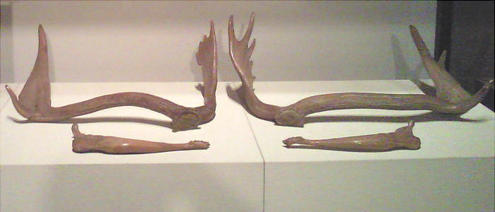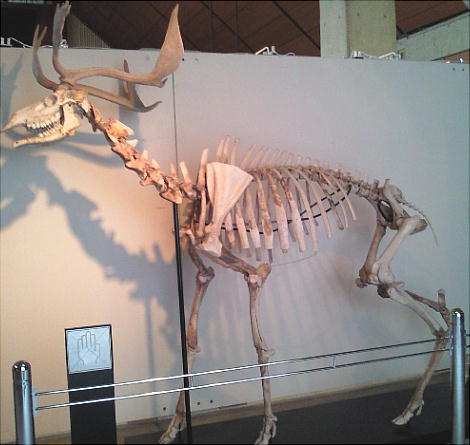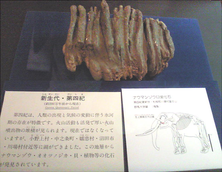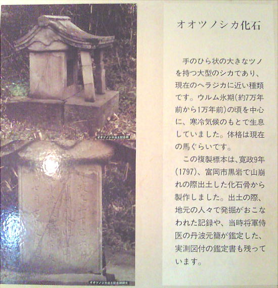 上右はオオツノシカ前身骨格。江戸時代(1797)、群馬県富岡市黒岩で、大雨による山崩れの際住民により掘り出された。