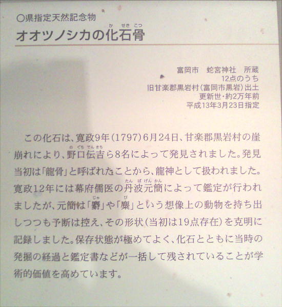 発見時の記録や鑑定書などが残っている。現在の馬くらいの大きなシカで、当時は龍の骨だと言われ、雨乞いにも利用され