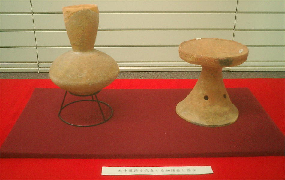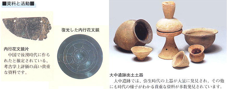 資料館は昭和60年(1985)に開館した。主な収蔵品は、隣接する「大中遺跡」からの出土品に加えて、県指定史跡「愛宕塚古墳」