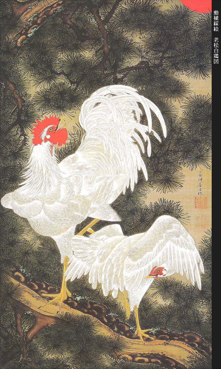 この構図の鶏や白凰の絵は、若沖はずいぶん昔から描いていたようである。今日残っている作品の中にも同じ構図を持った絵は多い。