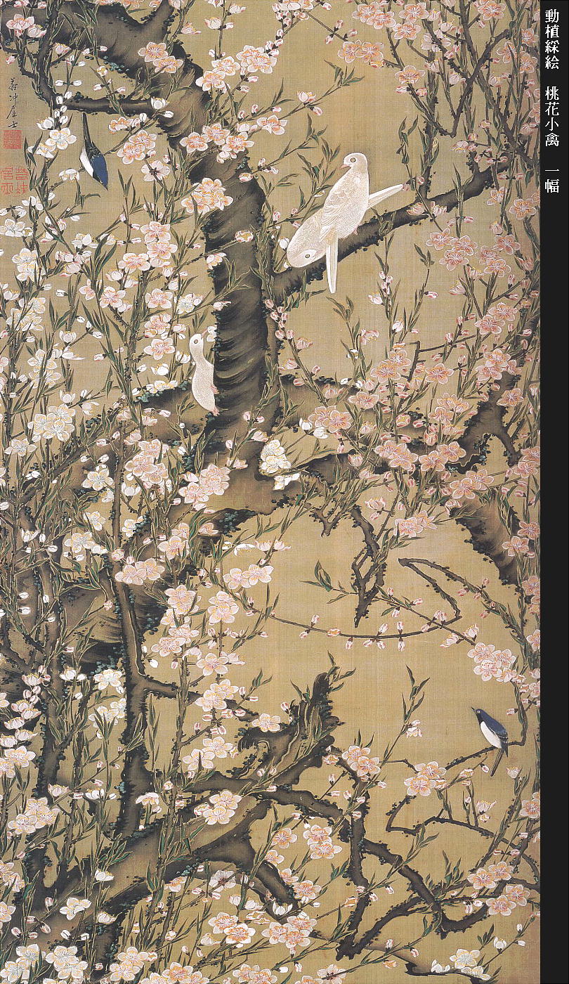 満開の桃の花に留まる白鳩三羽と、画面右下方に青いオオルリ(大きさから言えばコルリかな?)一羽が和む、春の日の情景を描く。 中央下に描かれたS字型の枝がアクセントのようだ。真ん中太い枝の白鳩は、痩せすぎて鳩には見えない。桃の花の蕾が丁寧に描か れている。花びらは裏彩色で透き通っている。枝の折れた先からもまた新たな命が芽吹いている。