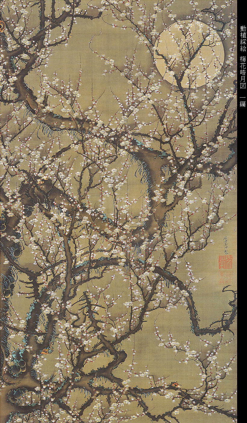 幽玄な月と、画面一杯に展開した梅との対比が美しい。墨で裏から黒く塗った裏彩色の手法を用いているので、画面全体の薄暗さが よく表現されている。月の部分だけは墨で塗られていない地肌のままである。つまり、この色がキャンパス(?)の地の色という事 になる。