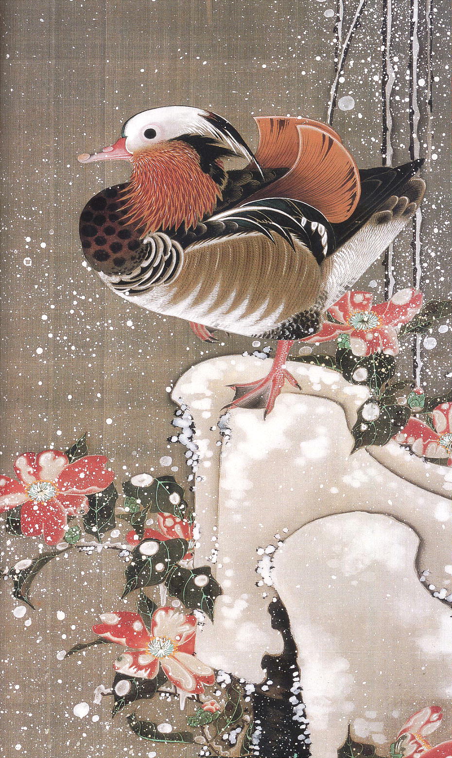 前ページ図の部分拡大。雪ではなく岩の上に鴛鴦が乗っている。それにしてもほんとに描写が細かい。