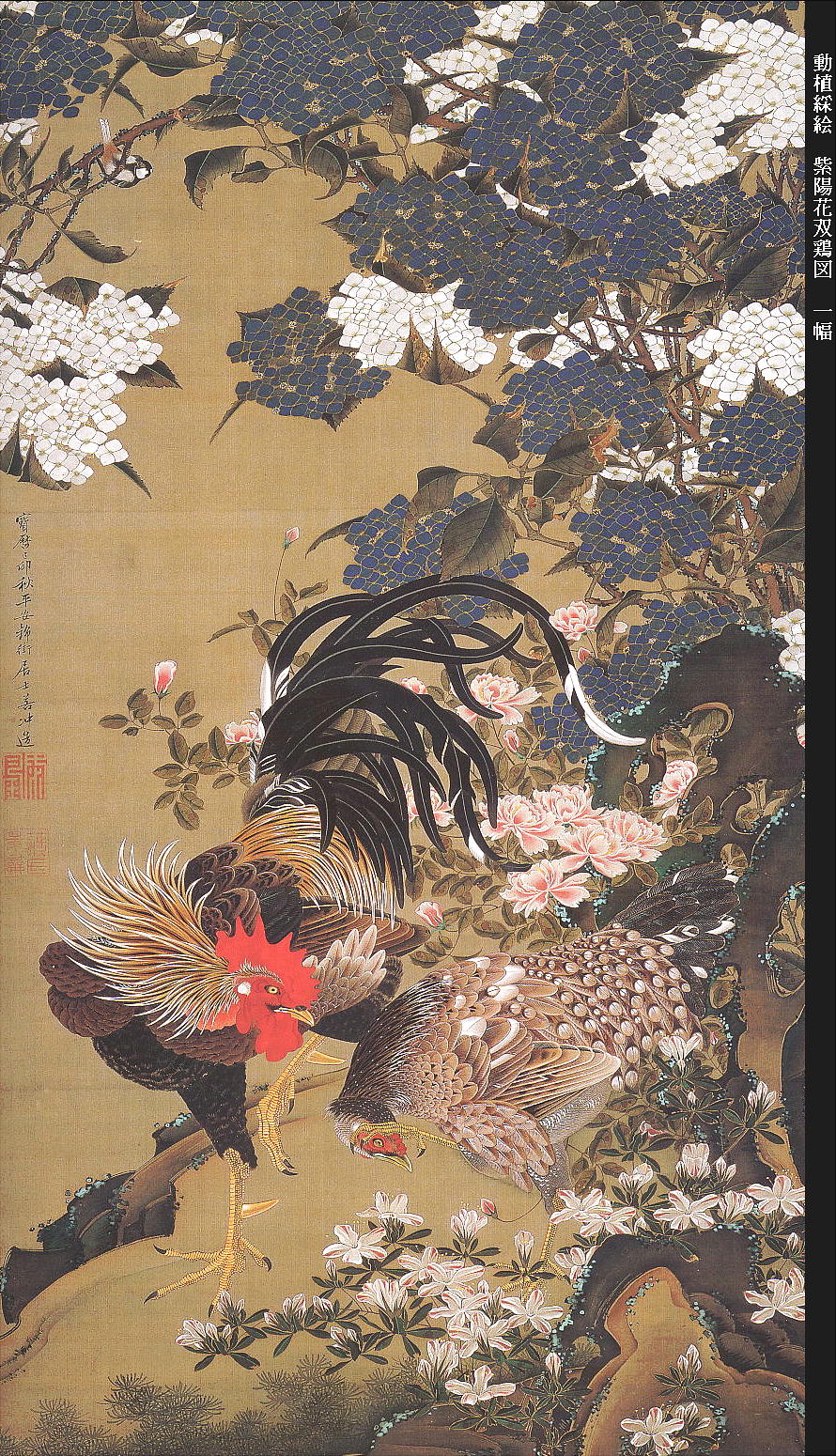 絹本着色。若冲が得意とした鶏図の代表作。尾を逆立てた雄鶏と、首をかく雌鶏。紺と白のアジサイ、バラ、ツツジが咲き誇る。幻
